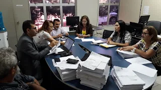 frente membros da administração municipal e uma equipe técnica do Tribunal de