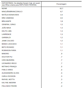 Pesquisa Seta divulgada nesta quinta-feira (25) mediu a preferência do eleitorado do Rio Grande do Norte para deputado federal.
